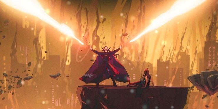 预告片中有一个镜头是奇异博士走出圣托勒姆圣所, 看到一座巨大的建筑倾斜 ,同时也正在分解成尘埃,镜头中可见的其他建筑也都是一样的场景。这一幕让人想起了《whatif…… 》第四集中那个分崩离析的世界。
